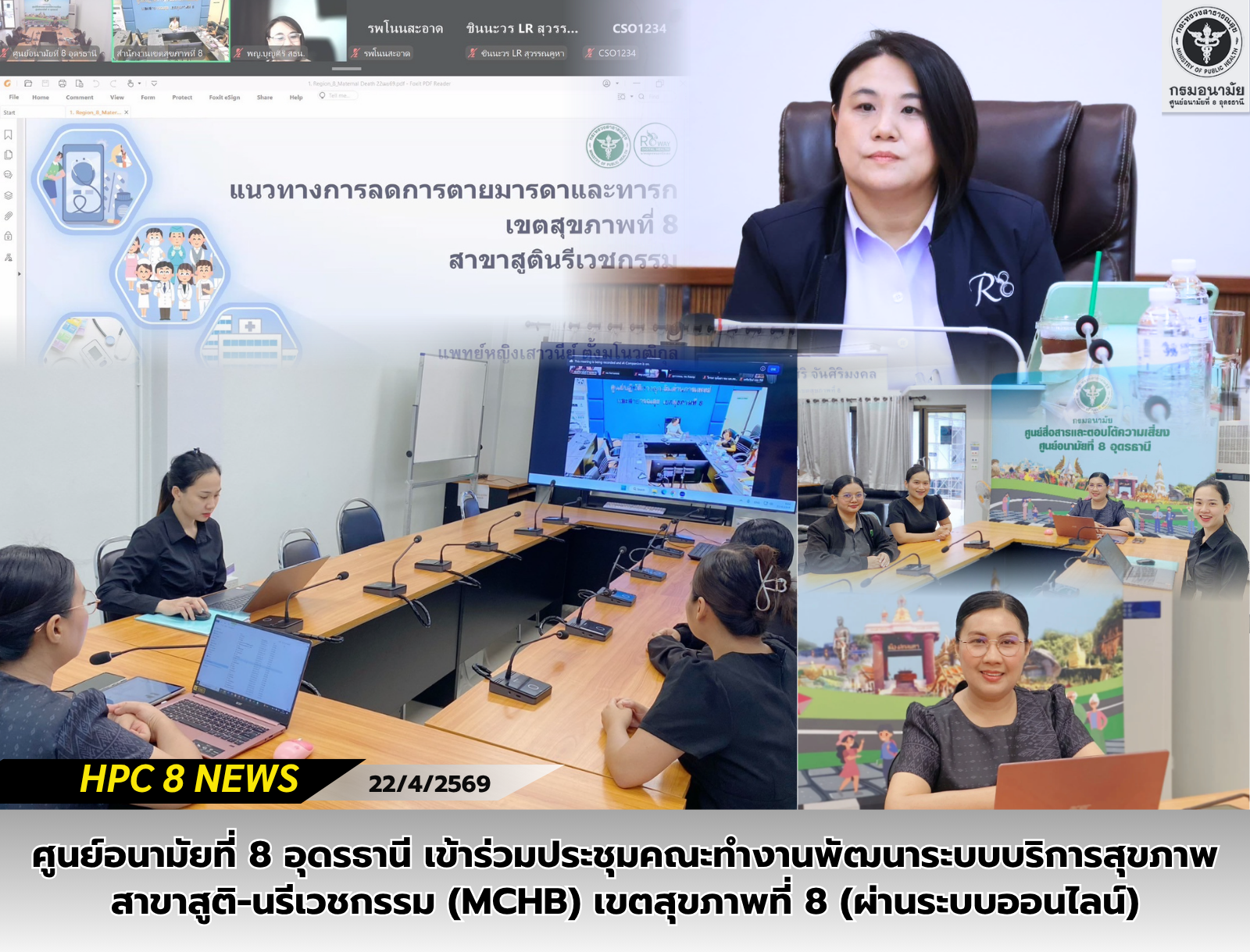 วันที่ 22 เมษายน 2569 นายแพทย์กฤษฎา ศิริชัยสิทธิ์ ผู้อำนวยการศูนย์อนามัยที่ 8 อุดรธานี มอบหมายให้กลุ่มพัฒนาอนามัยแม่และเด็ก เข้าร่วมประชุมคณะทำงานพัฒนาระบบบริการสุขภาพ สาขาสูติ-นรีเวชกรรม (MCHB ) เขตสุขภาพที่ 8 ผ่านระบบออนไลน์ มีวัตถุประสงค์ เพื่อติดตามผลการดำเนินงานพัฒนาระบบบริการสุขภาพ สาขาสูติ-นรีเวชกรรมในปี 69 ทั้ง7จังหวัดในเขตสุขภาพที่ 8 เพื่อขับเคลื่อนการดำเนินงานอนามัยแม่และเด็กในประเด็นสำคัญที่มุ่งเน้น 5 ประเด็นที่สำคัญ ได้แก่ การฝากครรภ์คุณภาพ (การคัดกรองสุขภาพจิตและสารเสพติดในหญิงตั้งครรภ์) การป้องกันการคลอดก่อนกำหนด การจัดการระบบ One Province One labor room และสถานการณ์มารดาตายเขตสุขภาพที่ 8 และผู้แทนกลุ่มพัฒนาอนามัยแม่และเด็ก ชี้แจงแนวทางบริการฝากครรภ์ 8 ครั้งตามเกณฑ์และการฝากครรภ์คุณภาพ โดยนางสาวดวงใจ กันธิยา รองหัวหน้ากลุ่มพัฒนาอนามัยแม่และเด็ก พร้อมให้ข้อเสนอแนะแนวทางพัฒนาระบบบริการให้เป็นไปตามเกณฑ์มาตรฐานงานอนามัยแม่และเด็ก โดยมีแพทย์หญิงบุญศิริ จันศิริมงคล สาธารณสุขนิเทศก์ เขตสุขภาพที่ 8 เป็นประธานการประชุม แพทย์หญิงเสาวนีย์ ตั้งมโนวุฒิกุล ตำแหน่งนายแพทย์เชี่ยวชาญ (สูติแพทย์เฉพาะทางด้านเวชศาสตร์การเจริญพันธุ์) และประธานคณะทำงานพัฒนาระบบบริการสุขภาพ สาขาสูตินรีเวชกรรม เขตสุขภาพที่ 8 มีผู้เข้าร่วมประชุมประกอบด้วยประธาน และเลขาคณะทำงานพัฒนาระบบบริการสุขภาพ สาขาสูตินรีเวชกรรม พยาบาล หัวหน้าแผนก ANC, LR , PP เขตสุขภาพที่8 จำนวน 100 Users