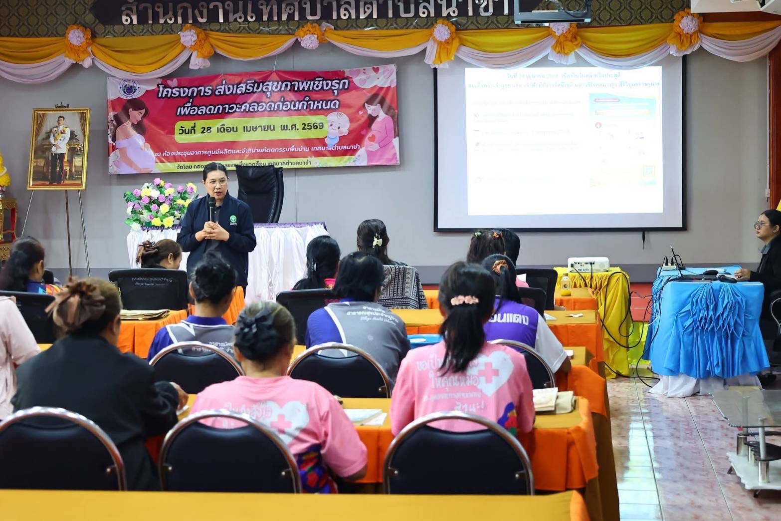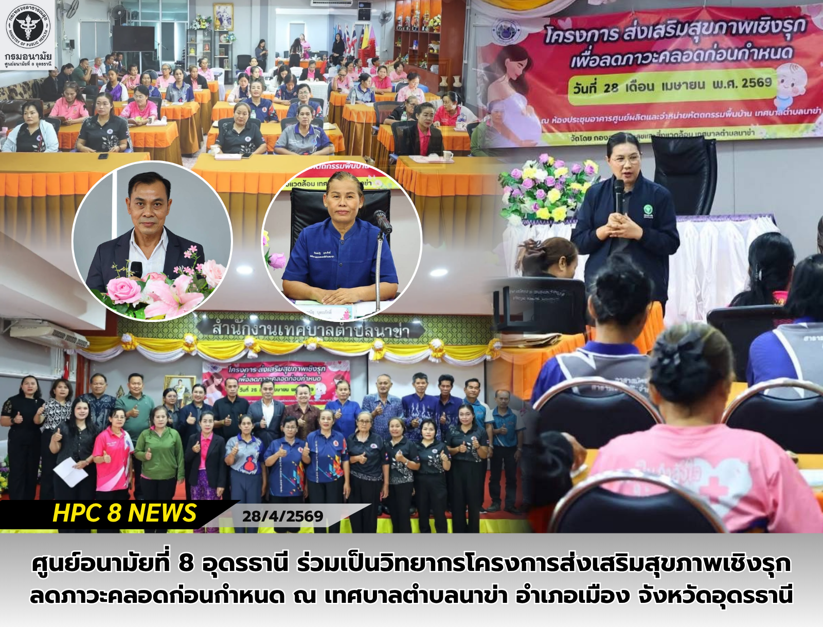 วันที่ 28 เมษายน 2569 นายแพทย์กฤษฎา ศิริชัยสิทธิ์ ผู้อำนวยการศูนย์อนามัยที่ 8 อุดรธานี มอบหมายให้เจ้าหน้าที่กลุ่มพัฒนาอนามัยแม่และเด็ก ร่วมเป็นวิทยากรโครงการส่งเสริมสุขภาพเชิงรุกเพื่อลดภาวะคลอดก่อนกำหนด ณ ห้องประชุมอาคารศูนย์ผลิตและจำหน่ายหัตถกรรมพื้นบ้าน เทศบาลตำบลนาข่า อำเภอเมือง จังหวัดอุดรธานี โดยมีวัตถุประสงค์ เพื่อลดอัตราการตายของมารดาและทารก จากการคลอดก่อนกำหนด ลดอัตราการคลอดก่อนกำหนด และส่งเสริมการมีส่วนร่วมของภาคีเครือข่ายในการดูแลสุขภาพหญิงตั้งครรภ์ ผู้เข้าร่วมรับการอบรมประกอบด้วย อาสาสมัครประจำหมู่บ้าน และหญิงวัยเจริญพันธุ์ จำนวน 50 คน