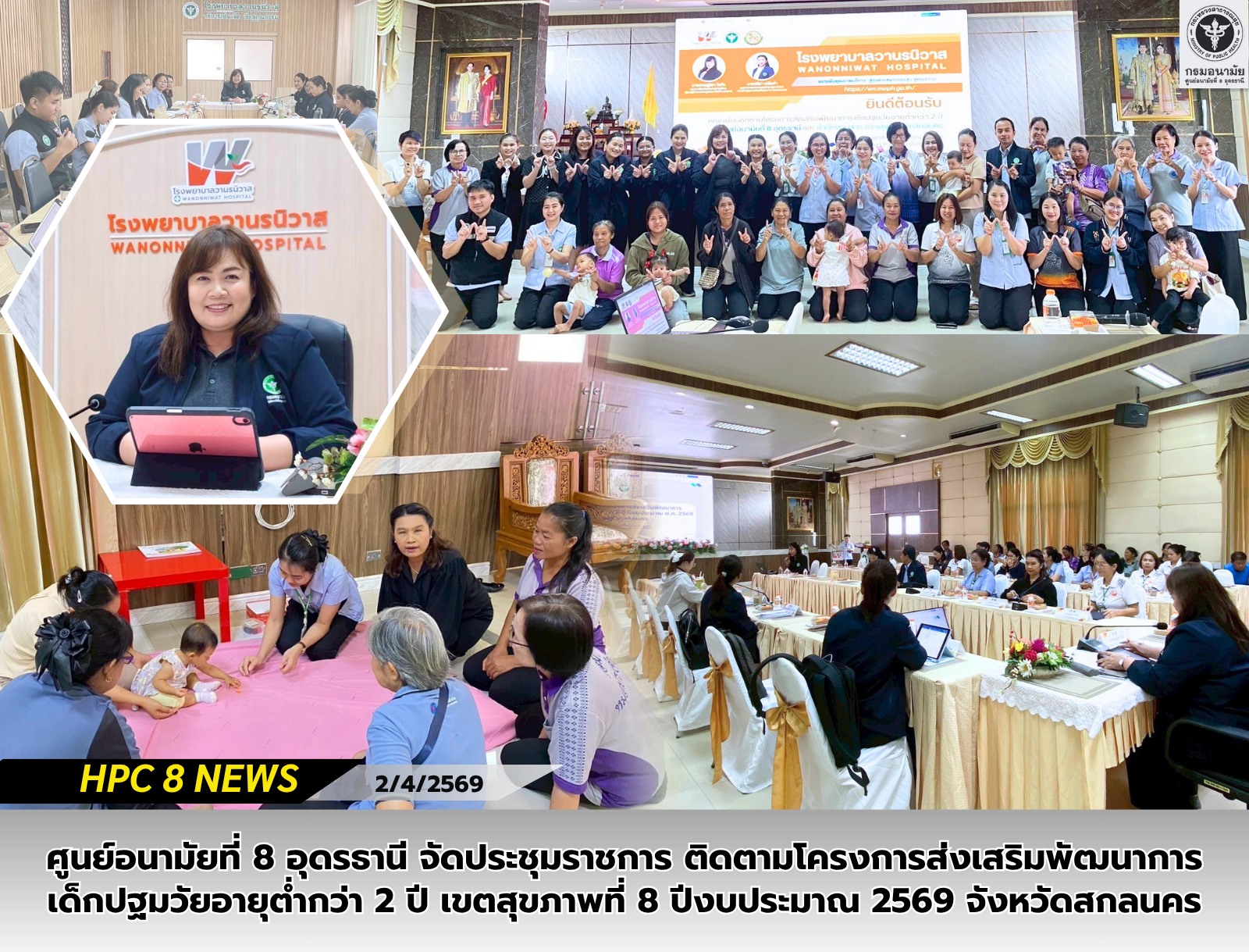 วันที่ 2 เมษายน 2569 นายแพทย์กฤษฎา ศิริชัยสิทธิ์ ผู้อำนวยการศูนย์อนามัยที่ 8 อุดรธานี มอบหมายให้กลุ่มพัฒนาอนามัยแม่และเด็ก นำโดยนางสาวสุนิสา ใจท้ง หัวหน้ากลุ่มพัฒนาอนามัยแม่และเด็ก จัดประชุมราชการ ติดตามโครงการส่งเสริมพัฒนาการเด็กปฐมวัย อายุต่ำกว่า 2 ปี เขตสุขภาพที่ 8 ปีงบประมาณ 2569 ณ โรงพยาบาลวานรนิวาส อำเภอวานรนิวาส จังหวัดสกลนคร ร่วมกับสำนักงานสาธารณสุขจังหวัดสกลนคร โดยมีวัตถุประสงค์ เพื่อติดตามโครงการส่งเสริมพัฒนาการเด็กปฐมวัย อายุต่ำกว่า 2 ปี เขตสุขภาพที่ 8 ปีงบประมาณ 2569 ผู้เข้าร่วมประชุมประกอบด้วย เจ้าหน้าที่สาธารณสุข อสม. ผู้ดูแลเด็ก และเด็กปฐมวัยกลุ่มเป้าหมาย รวมทั้งสิ้น 60 คน