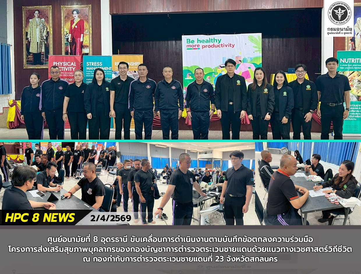 วันที่ 2 เมษายน 2569 นายแพทย์กฤษฎา ศิริชัยสิทธิ์ ผู้อำนวยการศูนย์อนามัยที่ 8 อุดรธานี และกลุ่มพัฒนาการส่งเสริมสุขภาพวัยทำงาน จัดกิจกรรมการส่งเสริมสุขภาพบุคลากรของกองกำกับการตำรวจตระเวนชายแดนที่ 23 จังหวัดสกลนคร ด้วยแนวทางเวชศาสตร์วิถีชีวิต และสนับสนุน ชุด Health Station เฝ้าระวังโรค NCDs โดยมี ว่าที่พ.ต.อ.ธีรศักดิ์ โพธิ์ศรีมา ผู้กำกับการตำรวจตระเวนชายแดนที่ 23 เป็นผู้ให้การต้อนรับ วัตถุประสงค์เพื่อสนับสนุนการลดปัจจัยเสี่ยงและลดอัตราการเกิดโรคไม่ติดต่อเรื้อรัง (NCDs) ในกลุ่มวัยทำงาน และขับเคลื่อนการดำเนินงานตามบันทึกข้อตกลงความร่วมมือโครงการส่งเสริมสุขภาพบุคลากรของกองบัญชาการตำรวจตระเวนชายแดน ด้วยแนวทางเวชศาสตร์วิถีชีวิต ระหว่างสำนักปลัดกระทรวงสาธารณสุข กรมอนามัย และกองบัญชาการตำรวจตระเวนชายแดน เพื่อให้เกิดกลไกการดำเนินงานส่งเสริมสุขภาพด้วยแนวทางเวชศาสตร์วิถีชีวิตอย่างเป็นระบบ สร้างความรอบรู้และนำไปสู่การมีพฤติกรรมสุขภาพที่พึงประสงค์ มีผู้เข้าร่วมกิจกรรมจากกองกำกับการตำรวจตระเวนชายแดนที่ 23 และศูนย์อนามัยที่ 8 อุดรธานี จำนวน 200 คน