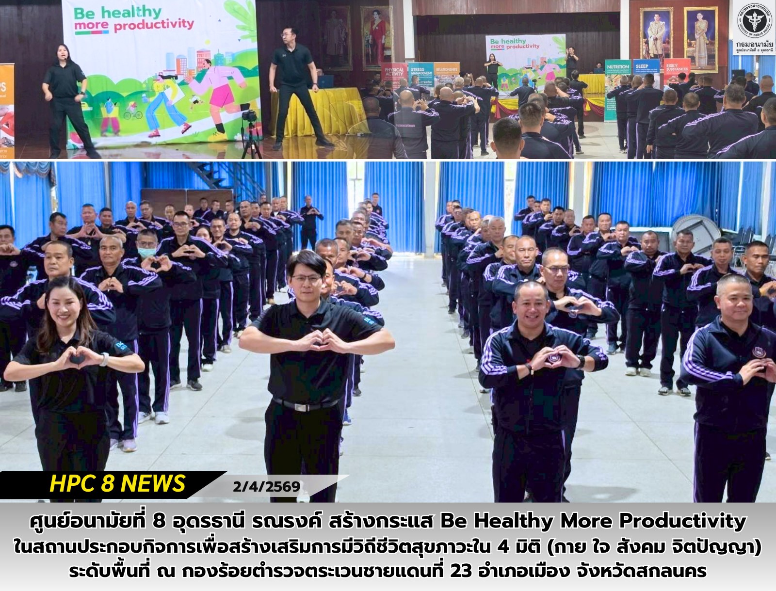 นย์อนามัยที่ 8 อุดรธานี รณรงค์ สร้างกระแส Be Healthy More Productivity ในสถานประกอบกิจการเพื่อสร้างเสริมการมีวิถีชีวิตสุขภาวะใน 4 มิติ (กาย ใจ สังคม จิตปัญญา) ระดับพื้นที่ ณ กองร้อยตำรวจตระเวนชายแดนที่ 23 อำเภอเมือง จังหวัดสกลนคร