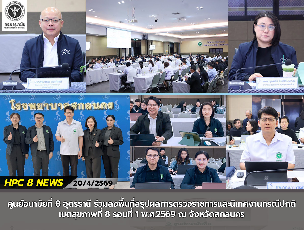 วันที่ 19 - 20 เมษายน 2569 นำโดยนายแพทย์กฤษฎา ศิริชัยสิทธิ์ ผู้อำนวยการศูนย์อนามัยที่ 8 อุดรธานี และ ดร.ธนิสา อนุญาหงษ์ รองผู้อำนวยการศูนย์อนามัยที่ 8 อุดรธานี พร้อมด้วยคณะเจ้าหน้าที่ศูนย์อนามัยที่ 8 อุดรธานี ร่วมลงพื้นที่สรุปผลการตรวจราชการและนิเทศงานกรณีปกติ เขตสุขภาพที่ 8 รอบที่ 1 พ.ศ.2569 ณ จังหวัดสกลนคร โดยมีนายแพทย์สามารถ ถิระศักดิ์ ผู้ตรวจราชการกระทรวงสาธารณสุข เขตสุขภาพที่ 8 และแพทย์หญิงบุญศิริ จันศิริมงคล สาธารณสุขนิเทศก์ เขตสุขภาพที่ 8 เป็นประธานในการติดตามผลการดำเนินงานตามนโยบาย และแผนการขับเคลื่อนพัฒนางานสาธารณสุข และแก้ไขปัญหาสาธารณสุขที่สำคัญในพื้นที่เขตสุขภาพที่ 8 ให้บรรลุตามเป้าหมายที่กำหนด