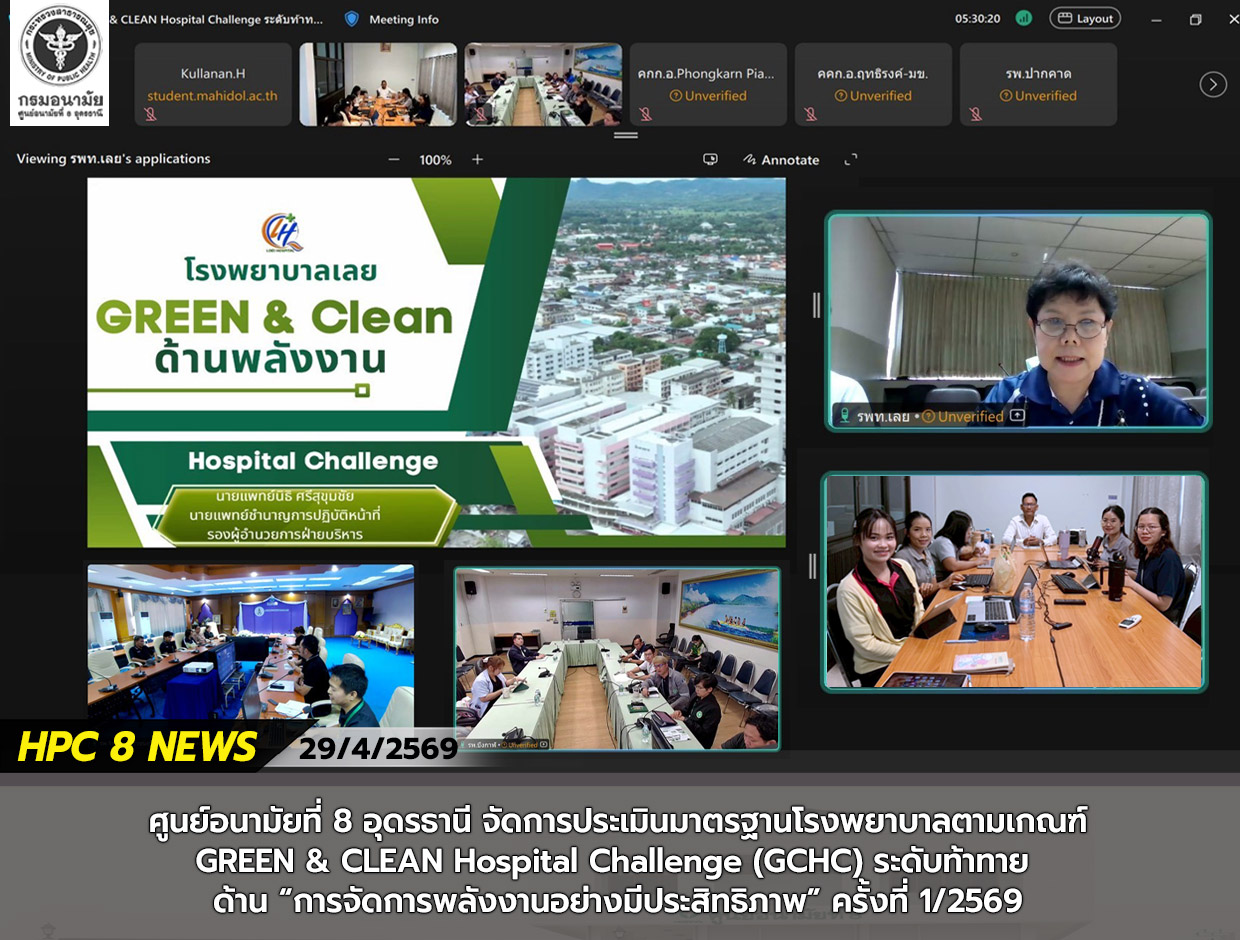 วันที่ 29 เมษายน 2569 ศูนย์อนามัยที่ 8 อุดรธานี จัดการประเมินมาตรฐานโรงพยาบาลตามเกณฑ์ GREEN & CLEAN Hospital Challenge (GCHC) ระดับท้าทาย ด้าน “การจัดการพลังงานอย่างมีประสิทธิภาพ” ครั้งที่ 1/2569 ร่วมกับคณะกรรมการตรวจประเมิน ได้แก่ 1.ผศ.ดร.ฤธิรงค์ จังโกฏิ อาจารย์ประจำคณะสาธารณสุขศาสตร์ มหาวิทยาลัยขอนแก่น 2.นายพงศ์กานต์ เปี่ยมสุทธิธรรม บริษัท เอ็นจิเนียริ่ง โซลลูชั่น โพรวายเดอร์ จำกัด เพื่อยกระดับสถานบริการสาธารณสุขให้เป็นมิตรต่อสิ่งแวดล้อมและมีความยั่งยืน โดยมีโรงพยาบาลที่เข้ารับการประเมินทั้งหมด 6 แห่ง ได้แก่